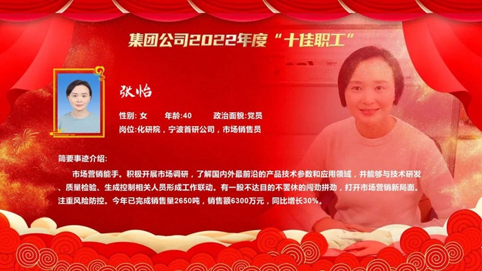 為激勵苦干實干、樹立身邊典型、打造先進品牌,不斷強化廣大職工“企業(yè)發(fā)展、我有責(zé)任,拼搏‘3+1’、我在行動”主人翁意識,促進企業(yè)高質(zhì)量發(fā)展,經(jīng)企業(yè)推薦、廣泛遴選、優(yōu)中選優(yōu)、民主集中、會議研究,北京化工集團決定,授予北京市化學(xué)工業(yè)研究院有限責(zé)任公司寧波首研公司市場銷售員張怡(女)等10名同志北京化工集團2022年度“十佳職工”,并在北京化工集團二屆一次職代會暨2023年度工作會上予以表彰。