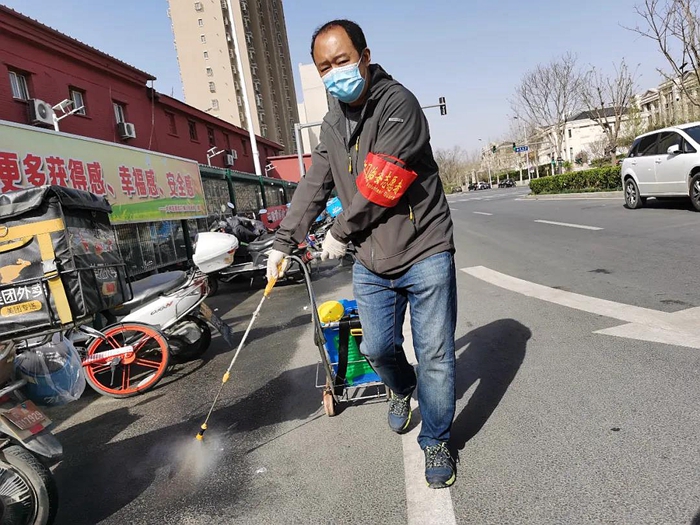 社區(qū)防疫值守工作是我們國家疫情防控的重要手段之一,消殺工作也是對社區(qū)值守人員、進出居民健康防疫保障的有效舉措。為了保證消毒效果,我每天到崗后,都會第一時間進行消殺。小到社區(qū)出入口的消毒腳墊,大到返京人員必經(jīng)的登記崗?fù)ざ际嵌ㄆ谙麣⒌闹攸c區(qū)域。還有卡口執(zhí)勤地面,乃至外賣電動車的停放區(qū)我都要讓我的“戰(zhàn)友”光顧一遍。