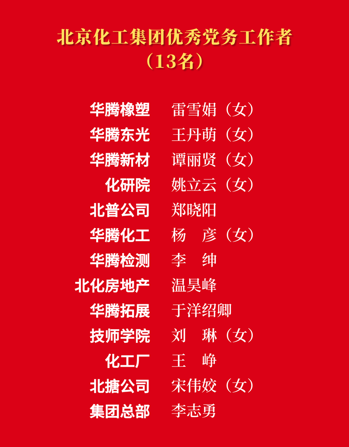為熱烈慶祝中國共產(chǎn)黨成立103周年,大力表彰在推進“十四五”規(guī)劃、推動集團“231”戰(zhàn)略布局、完成重點工作任務等各方面涌現(xiàn)出來的先進集體和先進個人,市國資委黨委決定,授予北搪黨委“先進基層黨組織”稱號,授予技師學院姜洪強“優(yōu)秀共產(chǎn)黨員”稱號,授予北京化工集團總部李志勇“優(yōu)秀黨務工作者”稱號;北京化工集團黨委決定,授予14個黨支部“先進基層黨支部”稱號,授予29名同志“優(yōu)秀共產(chǎn)黨員”稱號,授予13名同志“優(yōu)秀黨務工作者”稱號。
