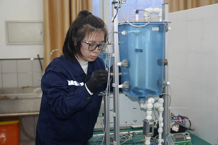 一滴水的旅程,關(guān)乎萬家冷暖,關(guān)乎一方水土。當(dāng)千家萬戶為春節(jié)團(tuán)圓而舉杯時,一群年輕人正在為守護(hù)那泓清泉背后的安全與生機(jī)而努力練習(xí)著。水處理技術(shù)項目實(shí)驗室里,來自河南、山西等地職院的11名年輕選手,正凝神搭建著微縮的“城市水脈”?;炷⒊恋?、過濾、消毒……一座現(xiàn)代化水廠的完整流程,在不足兩平方米的操作臺上正精密“上演”。選手趙可俯身調(diào)整管路,動作沉穩(wěn)而利落。教練目光如尺,在她身后半步距離之內(nèi),衡量著她每一次操作的精度。在新任世賽水處理技術(shù)項目中國專家組組長柯瑞華和教練團(tuán)的帶領(lǐng)下,趙可和參加實(shí)訓(xùn)的10名伙伴,正在努力融會貫通化學(xué)、生物、機(jī)械、自動化等多學(xué)科知識,目標(biāo)直指現(xiàn)代化污水處理廠的“總工程師”。春節(jié)前集訓(xùn)的日夜里,他們將反復(fù)演練從水質(zhì)分析到系統(tǒng)檢修的全套模塊。