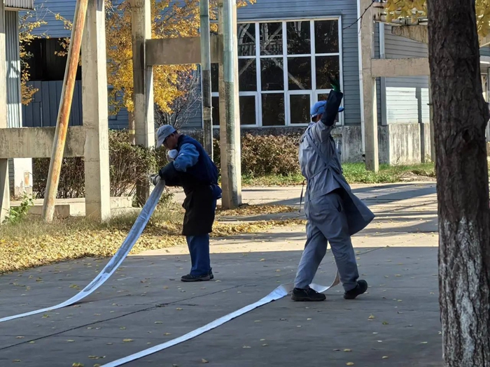 此外,在安全人員的組織下,干部職工還在消防水帶演習(xí)場所,現(xiàn)場連接消防水帶,實際演習(xí)了用消防水帶滅火的過程。