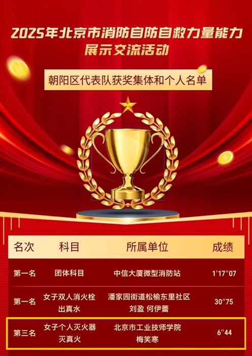 11月上旬,技師學(xué)院教師梅笑寒代表朝陽區(qū)參加北京市2025年消防自防自救力量能力展示交流活動,在“女子個人滅火器滅真火”項目中榮獲北京市第三名。此次交流活動,來自全市20支代表隊、600名消防安全重點單位、社區(qū)(村)自防自救力量隊員同場競技。