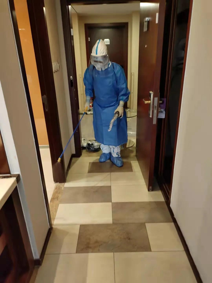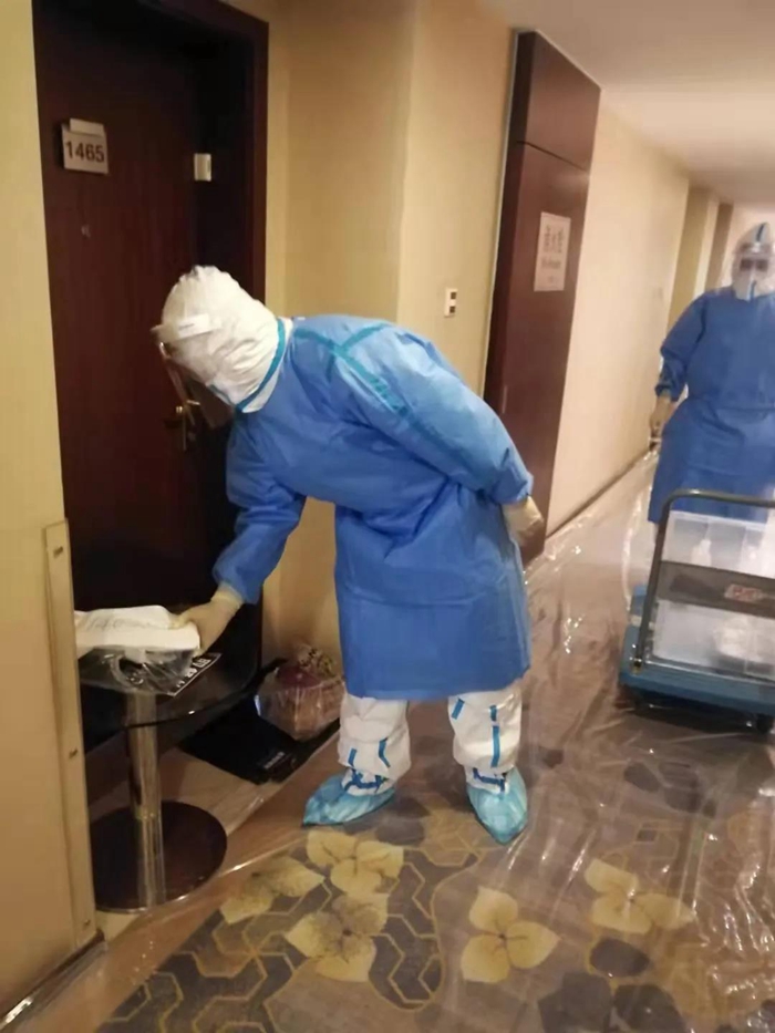困難和挑戰(zhàn)首先體現(xiàn)在前臺入住、離店手續(xù)、客房清潔的工作流程的較大變化上。前臺每次接到指揮部通知即將有新隔離人員入住或隔離人員解除隔離時,他們都需要全副武裝穿上防護服在前臺等候。每天都有隔離人員解除隔離,離開酒店后,消殺組會對客房、公共區(qū)域進行全面消毒??头糠?wù)組在隔離人員退房后,對所有隔離人員使用的物品嚴(yán)格按照感染性廢物進行處理,處理完畢后重新打掃恢復(fù)房間使用,這對于從未從事過醫(yī)療行業(yè)的員工來講,是一種全新挑戰(zhàn),在接受了醫(yī)護人員的緊急培訓(xùn)后,他們嚴(yán)格履行操作流程,對100多個房間進行了打掃翻房處理,保證了后續(xù)隔離觀察人員的順利入住。