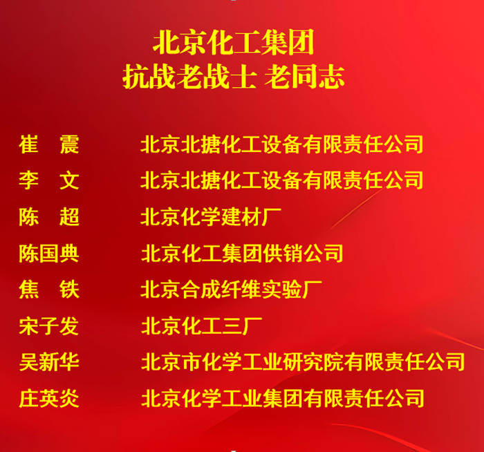 在紀(jì)念中國(guó)人民抗日戰(zhàn)爭(zhēng)暨世界反法西斯戰(zhàn)爭(zhēng)勝利 80 周年之際,黨中央、國(guó)務(wù)院、中央軍委為健在的抗戰(zhàn)老戰(zhàn)士、老同志授予“中國(guó)人民抗日戰(zhàn)爭(zhēng)勝利 80 周年紀(jì)念章”,北京化工集團(tuán)8位抗戰(zhàn)老戰(zhàn)士、老同志榮獲紀(jì)念章。