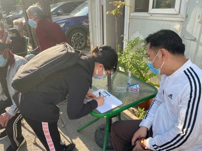 共產(chǎn)黨員宋文迪在通州區(qū)潞邑街道龍旺莊社區(qū)參加核酸檢測現(xiàn)場秩序維護(hù)或信息錄入工作。