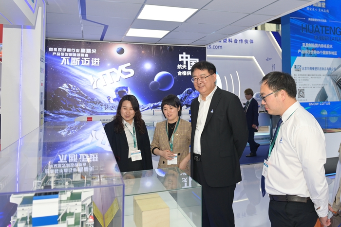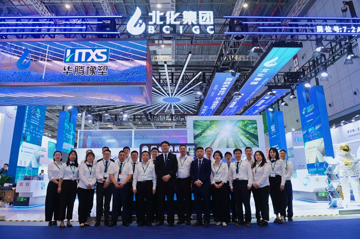 展會期間,北京化工集團黨委副書記、董事、總經理楊旭輝,副總經理張榮寰,總會計師金黎明也來到集團展臺參觀指導。楊旭輝一行聽取了現場各企業(yè)的詳細介紹,深入了解現場展示的儲氫瓶內膽材料、LNG船用膠、航天手套等高精尖產品,親切慰問現場工作人員。