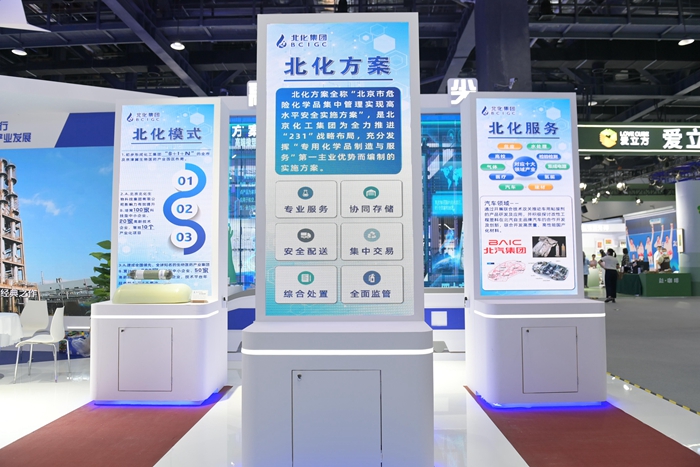 突出展現(xiàn)集團(tuán)發(fā)揮主責(zé)主業(yè)優(yōu)勢,圍繞首都“四個(gè)中心”功能建設(shè),積極融入“五子”聯(lián)動(dòng)新格局取得的豐碩成果,是北京化工集團(tuán)此次參展的一大亮點(diǎn)。“三個(gè)北化”——“北化方案”“北化模式”“北化服務(wù)”展屏矗立其間,構(gòu)筑安全管理全產(chǎn)業(yè)體系、發(fā)展生物醫(yī)藥大健康產(chǎn)業(yè)、服務(wù)首都產(chǎn)業(yè)鏈安全,成為集團(tuán)全新戰(zhàn)略方向和目標(biāo)。