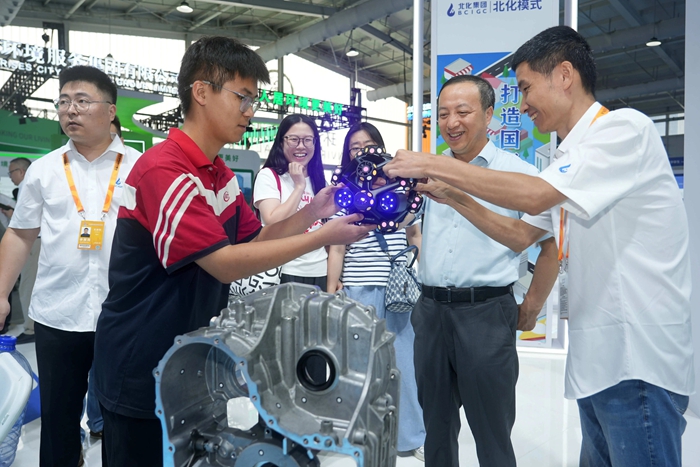 致力于職業(yè)技能人才培養(yǎng)的技師學(xué)院,在互動(dòng)中呈現(xiàn)世界技能大賽金牌項(xiàng)目——機(jī)電一體化的卓越成果,學(xué)院以人機(jī)互聯(lián)的3D掃描和工業(yè)機(jī)器人吸引了大批參觀者駐足,讓觀眾近距離感受產(chǎn)教融合的創(chuàng)新實(shí)踐和“化工+教育”的協(xié)同價(jià)值。