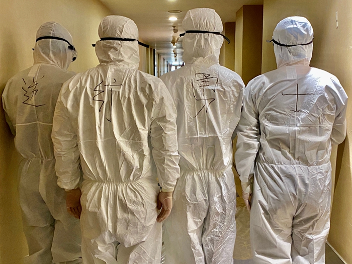 這樣的默默堅守,在我們一線服務(wù)人員身上更得到充分彰顯。在紅區(qū)工作的13名服務(wù)人員,每天要穿著厚厚的防護服為集中觀察人員送餐、送物品、搞清潔衛(wèi)生。每天,他們要全副武裝穿上防護服,并嚴格按照要求進行消殺。要一個房間一個房間地配送餐食,送餐完畢,還要一個房間一個房間地收納垃圾。由于防護服不透氣,剛一行動起來,他們已經(jīng)渾身是汗,但是他們每次都保質(zhì)保量按時完成了任務(wù)。請記住他們的名字:崔濤、陳宇、翟明星、于艷梅、任艷麗、吳迪、崔加倫、劉克云、孫家俊、單雪芳、杜迪、楊魯琦、侯迪。