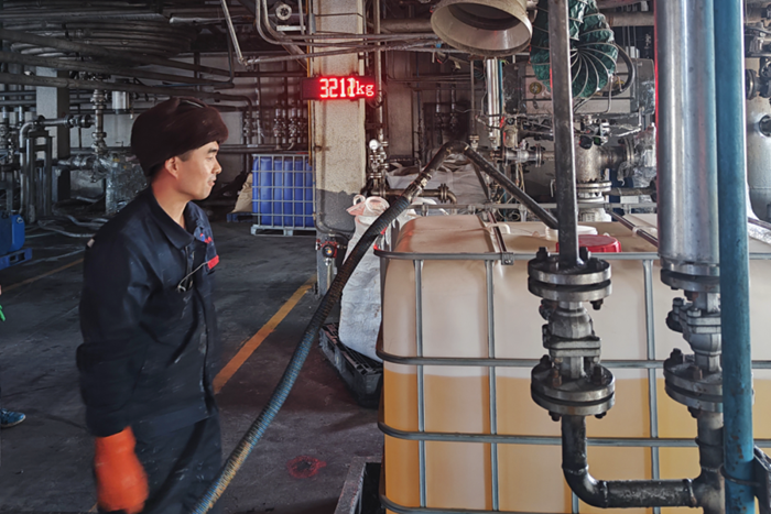 就在大年初六凌晨4時許,當班的黨員同志們按時將環(huán)保試劑配送到北京固廢物流有限公司消納站,按照工作安排,當天要把1噸的除磷劑輸送到反應罐中,他們熟練地進行插管、接泵、架線等各項工作。同時,他們還要把500公斤的檸檬酸固體送到消納站倉庫,以保證節(jié)日期間正常之需。